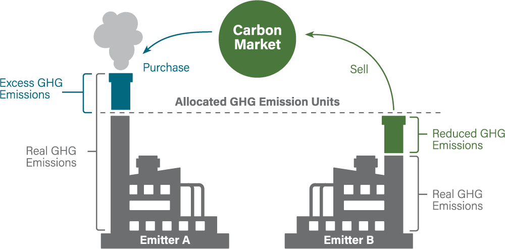 Trading Carbon Credits: Instead of paying fines or reducing production, Company A can buy carbon credits from Company B through the carbon market. Company B, having extra credits, sells them to Company A.